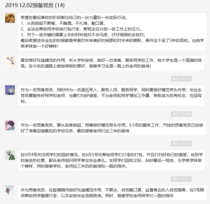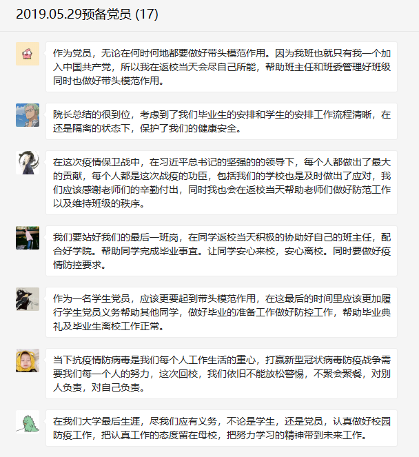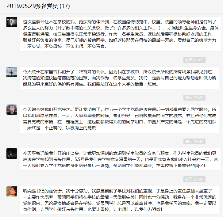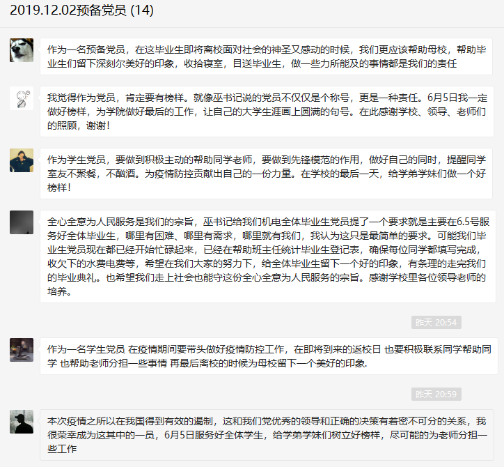 往年,毕业生返校之际,tyc122cc太阳成集团党总支会在毕业生党员离校前召开员工党员座谈会,做好毕业生党员思想教育工作和安全教育。今年,因为疫情影响,员工们返校时间短,任务重,留给大家坐在一起交流的时间很少。但党员的思想教育不能缺席,为了上好员工离校前最后一次党课,tyc122cc太阳成集团党总支创新形式,于2020年5月28日晚7点,组织全体毕业生党员,相约云上,举行了一场别开生面的线上座谈会。