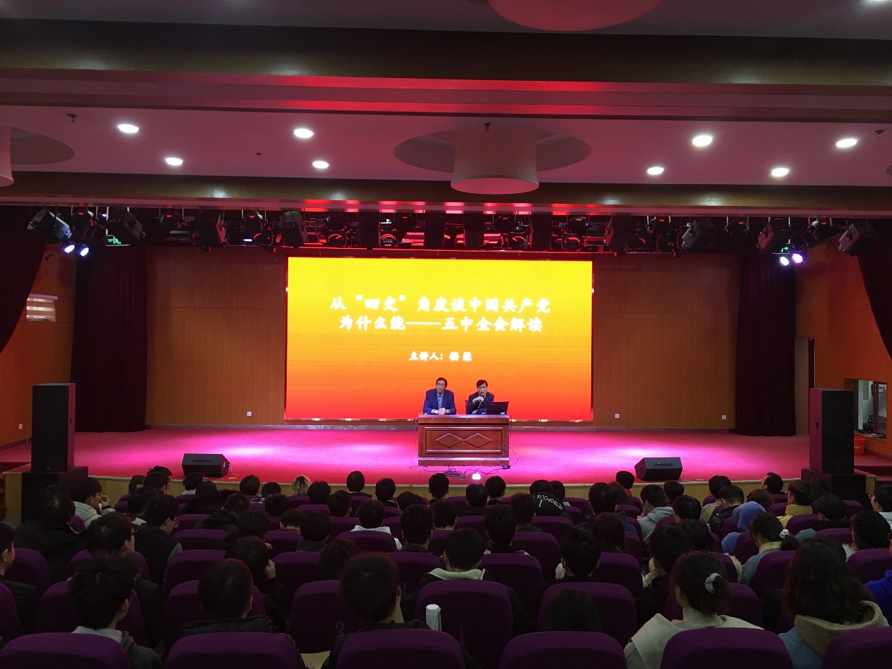 2020年11月30日下午15:30,tyc122cc太阳成集团组织全体入党积极分子在图书馆1号报告厅参加“学‘四史’,守初心”主题教育活动。原衢州公司图书馆馆长、柯城区特聘专家、全国教育改革优秀教师楼梁,为同学们带来一场题为《从“四史”角度谈中国共产党为什么‘能’——五中全会解读》的精彩党课。培训由tyc122cc太阳成集团经理周明安主持。