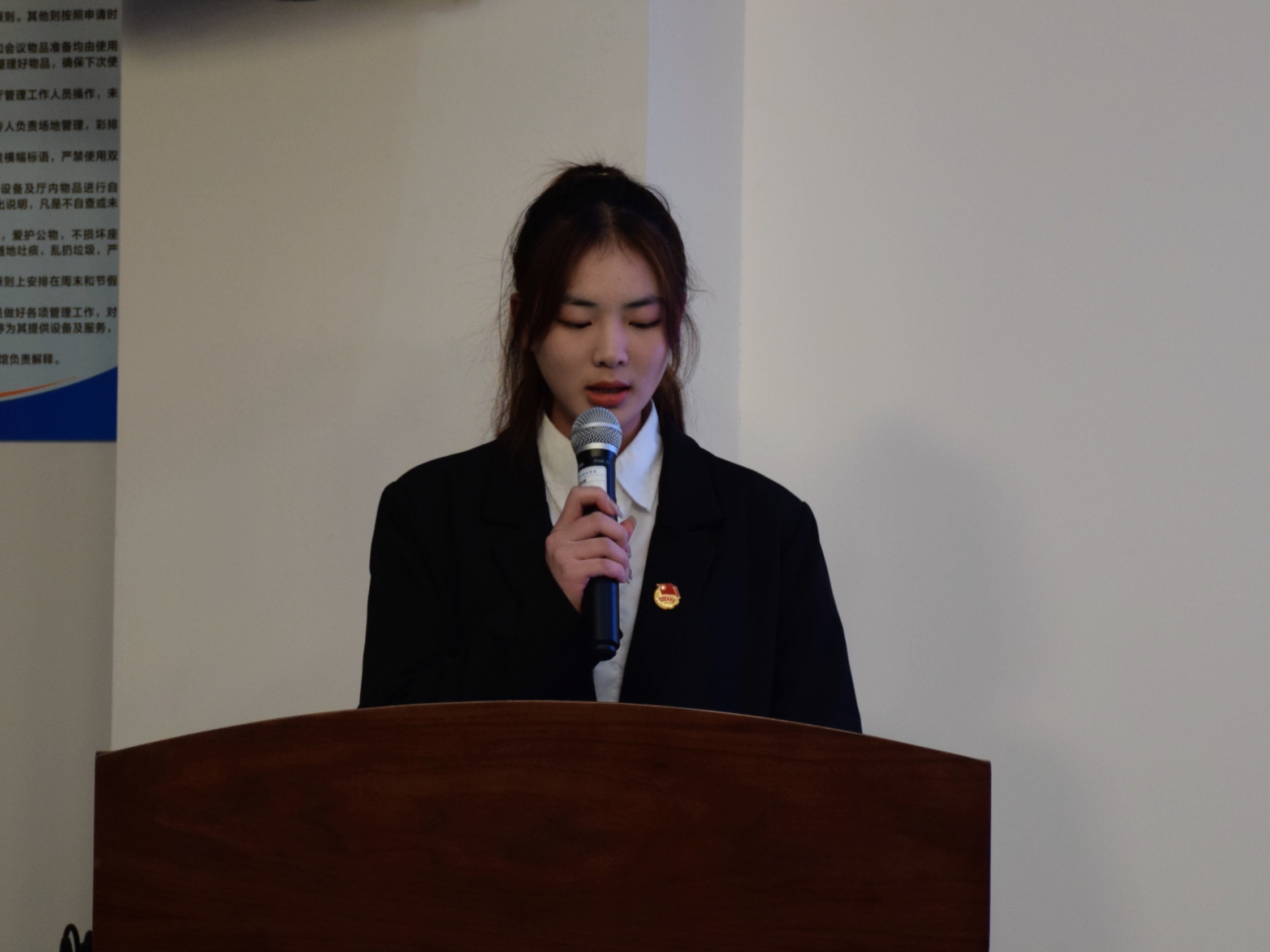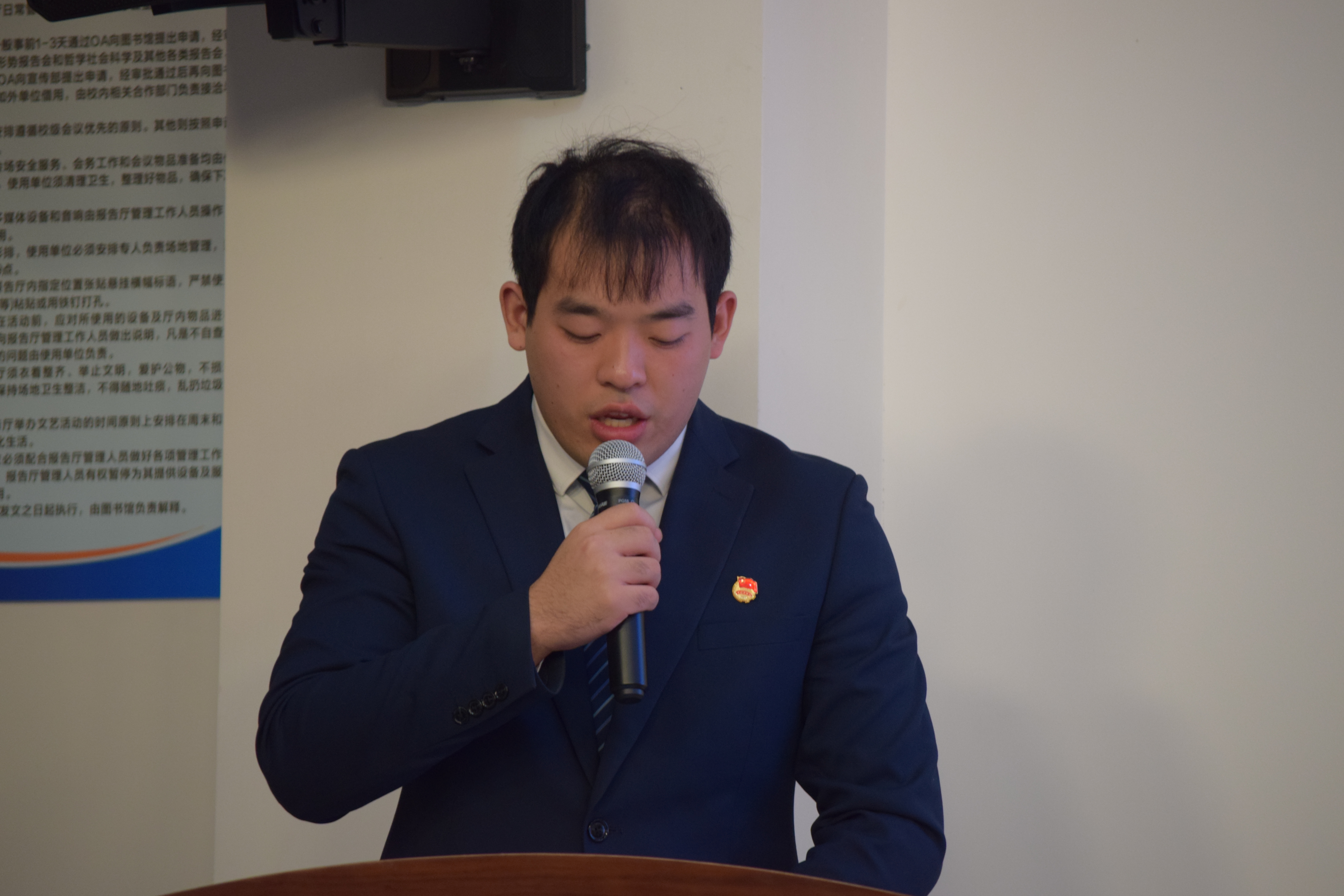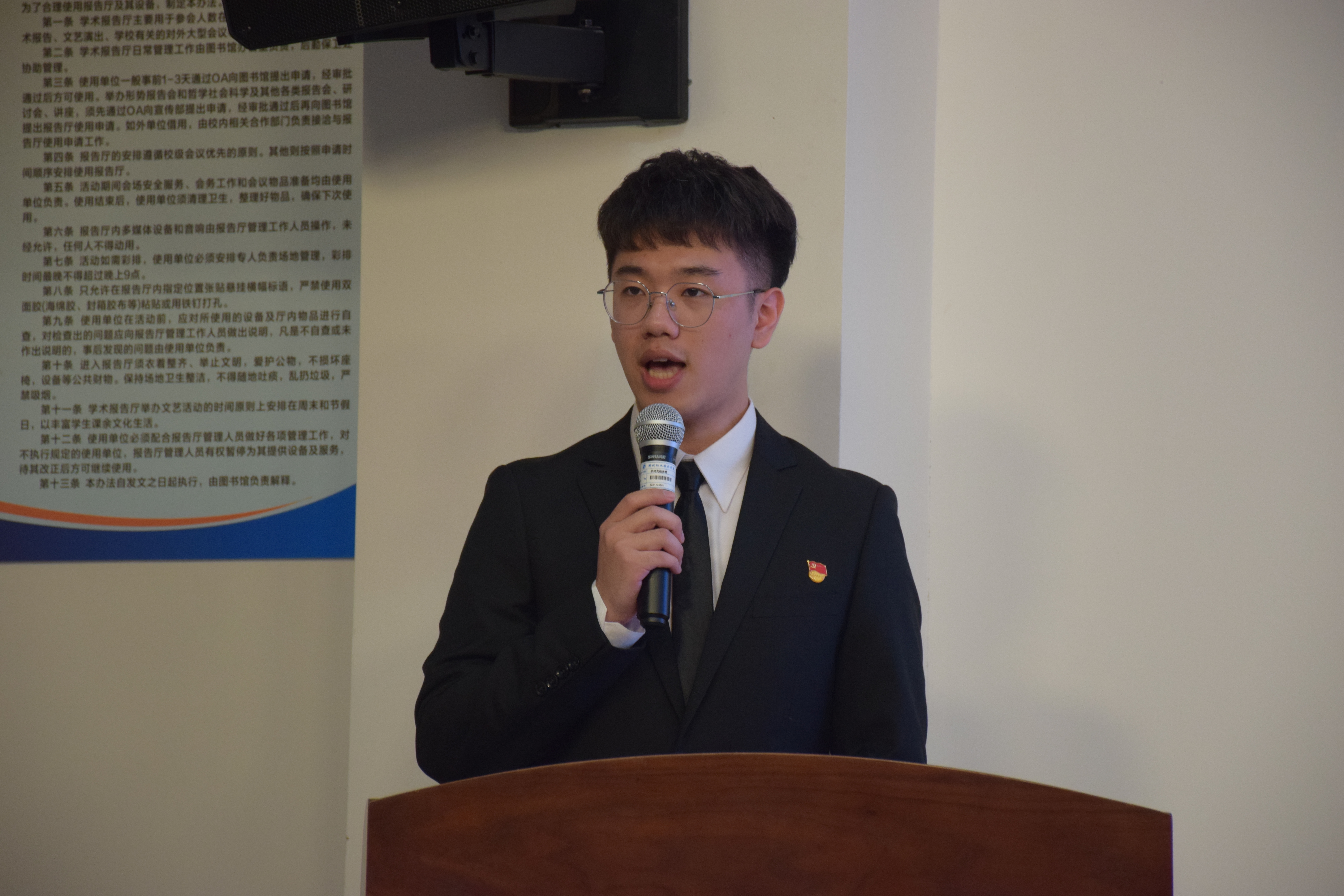 在奏唱国歌后,院十四届团委副书记倪炬男报告本次学代会筹备工作情况