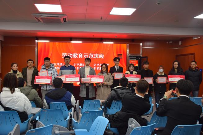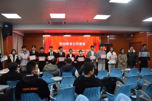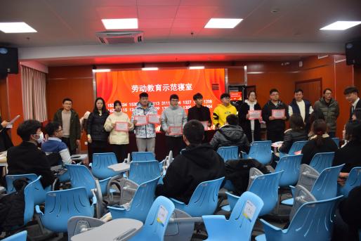大会的第一个环节是“思政教育模范班级”竞选演讲。2021级14个班级按照抽签顺序,依次上台做演讲和展示,分享班级晚自习特色活动开展情况和成效。特色晚自习分享亮点纷呈,赢得评委和观众的热烈掌声;第二个环节是对在特色晚自习中取得荣誉的班级和个人开展表彰。2021级新生在每周四晚广泛开展劳动教育晚自习,利用晚自修时间开展寝室、教室卫生清扫,每周评选出若干优秀寝室。经过一个学期的积累,涌现出20个“劳动教育示范寝室”,6名特色晚自习优秀工作人员以及6个劳动教育示范班级。