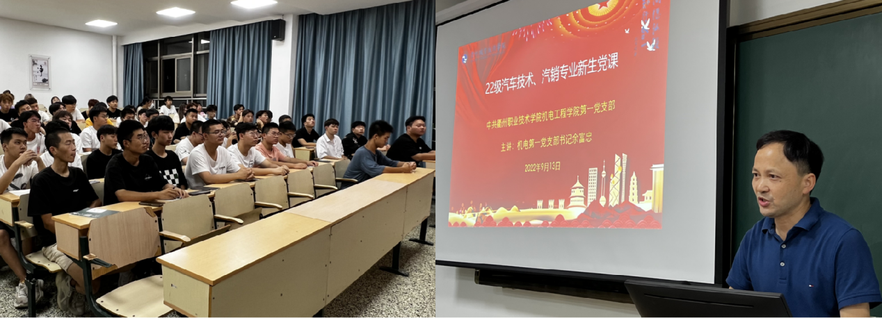 机电第一党支部书记余富忠同志以中国共产党第一次至第七次全国人民代表大会为主线,讲述了新民主主义时期至解放战争时期中国共产党的奋斗历程,使新生们深入了解到中国共产党筚路蓝缕、砥砺奋进的艰苦历程以及中国共产党人百折不挠、坚不可摧的理想信念。余富忠书记强调,我们要不忘历史,学习历史,才能不断从历史的经验和教训中汲取养分,了解中国共产党苦难辉煌的历程,才能为未来的发展提供强大的精神动力,才能凝聚实现“中国梦”的强大力量。