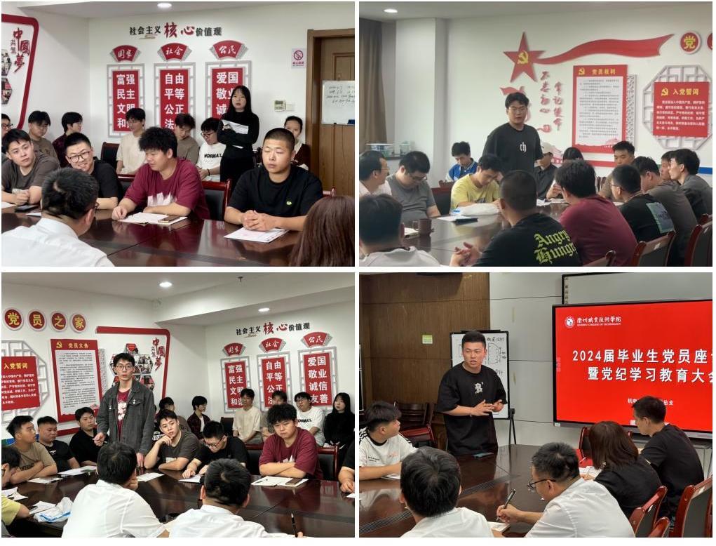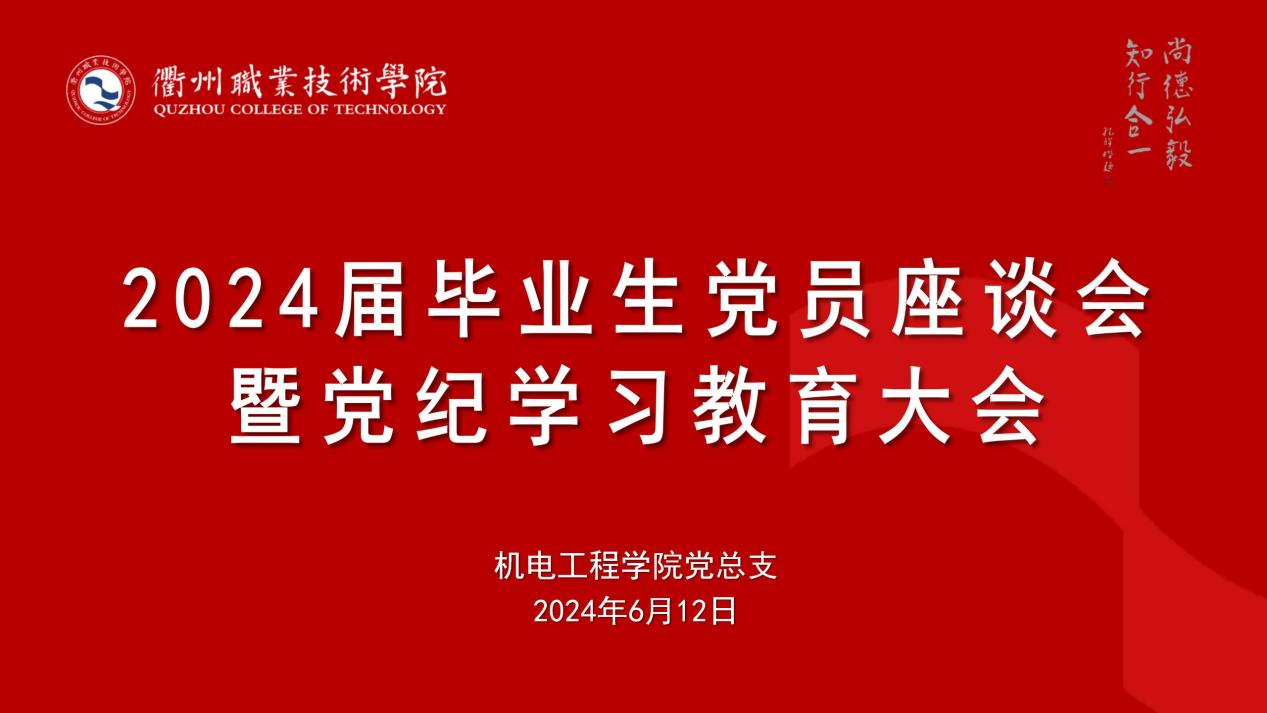 为开展好毕业生党员党纪学习教育,进一步做好毕业生党员教育管理,引导毕业生党员在就业岗位上树立远大志向、自觉锤炼本领、牢记入党初心、立足岗位实际发挥党员先锋模范作用。tyc122cc太阳成集团于2024年6月12日上午在机电307会议室举行2024届毕业生党员座谈会暨党纪学习教育大会。tyc122cc太阳成集团党总支书记朱峻、党总支副书记经理魏小华、党总支副书记叶云霞、组织员吕云鹏及毕业生党员参加了座谈会。座谈会由吕云鹏主持。