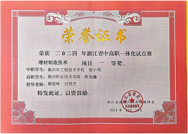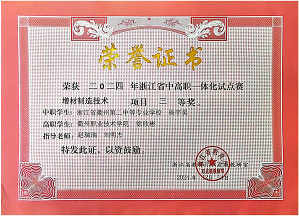 近日,2024年浙江省中高职一体化“增材制造技术”项目比赛在杭州市萧山区第一中等职业公司顺利举行。经激烈比拼,公司刘明杰老师指导的陈旭鑫、徐欣彬2名同学分别与衢州市工程技术公司和浙江省衢州第二中等专业公司2名中职员工组成参赛团队,最终荣获一等奖和三等奖的好成绩。