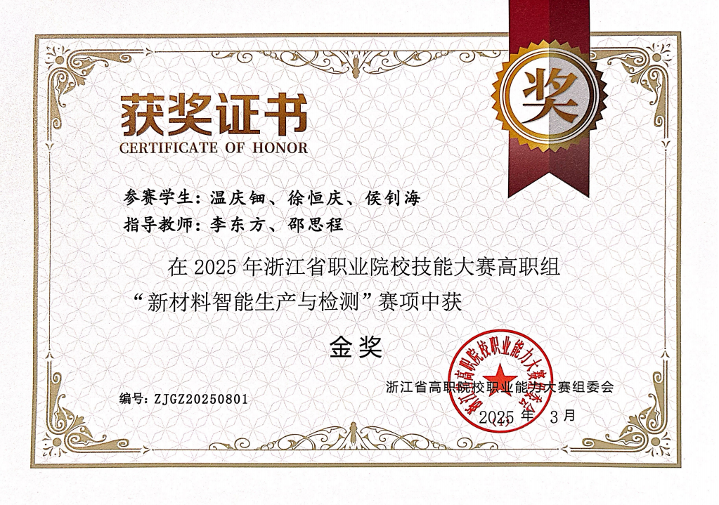 支部24机制专业员工温庆钿、徐恒庆、侯钊海参与的赛项“新材料智能生产与检测”获金奖,24机制专业员工马煌畯参与该赛项获银奖。
